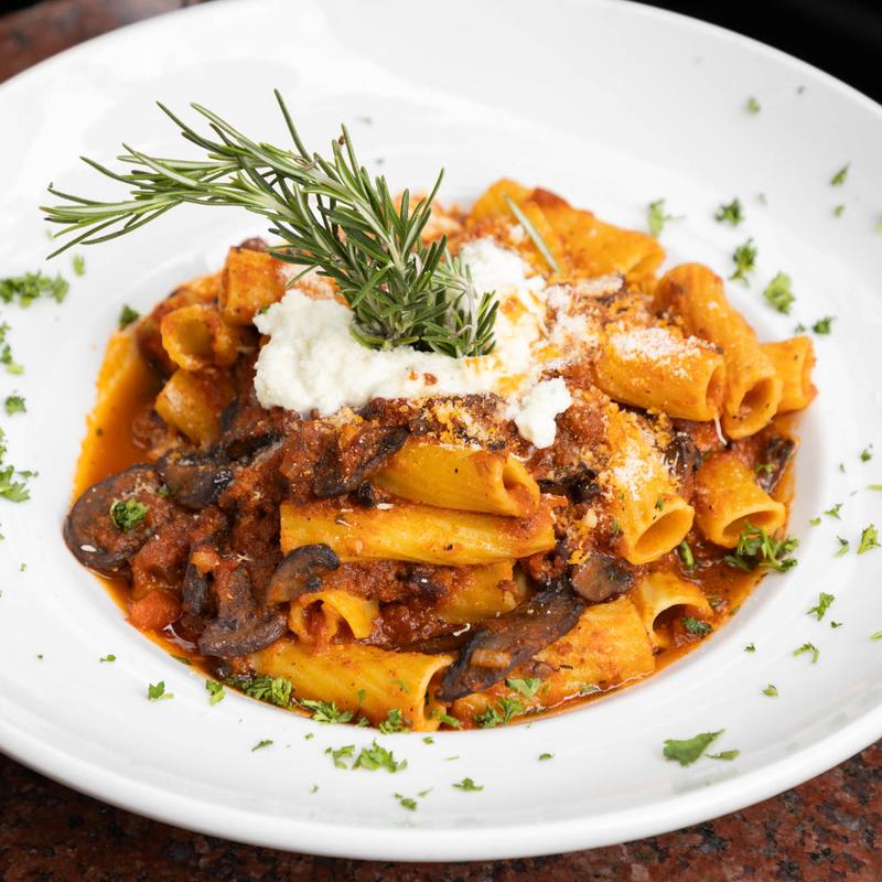 Italian Sausage, Roasted Eggplant, Red Onion, Ricotta, Pomodoro, Fresh Basil, Paccheri Pasta