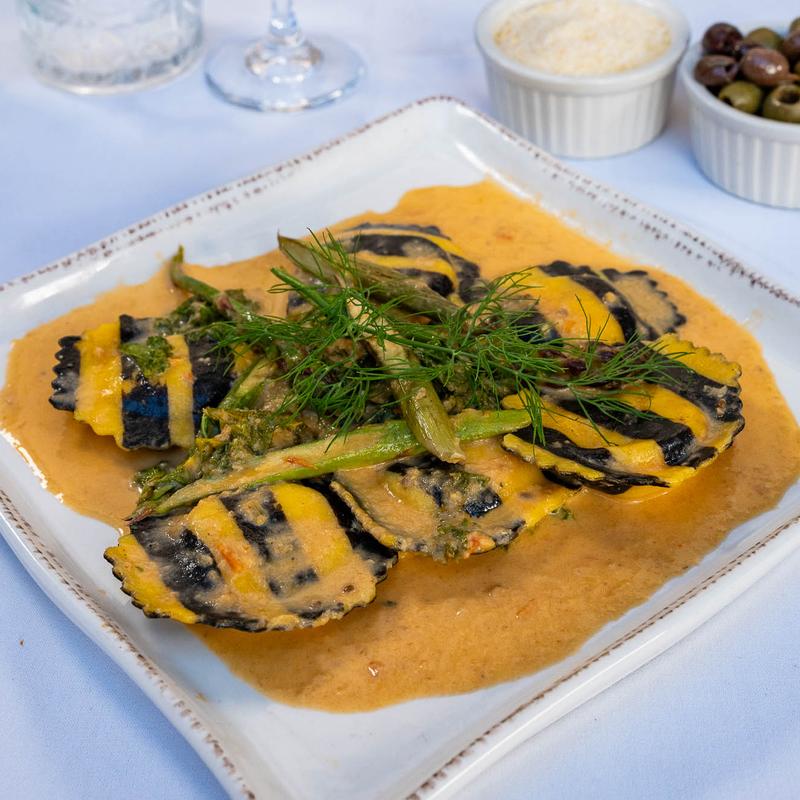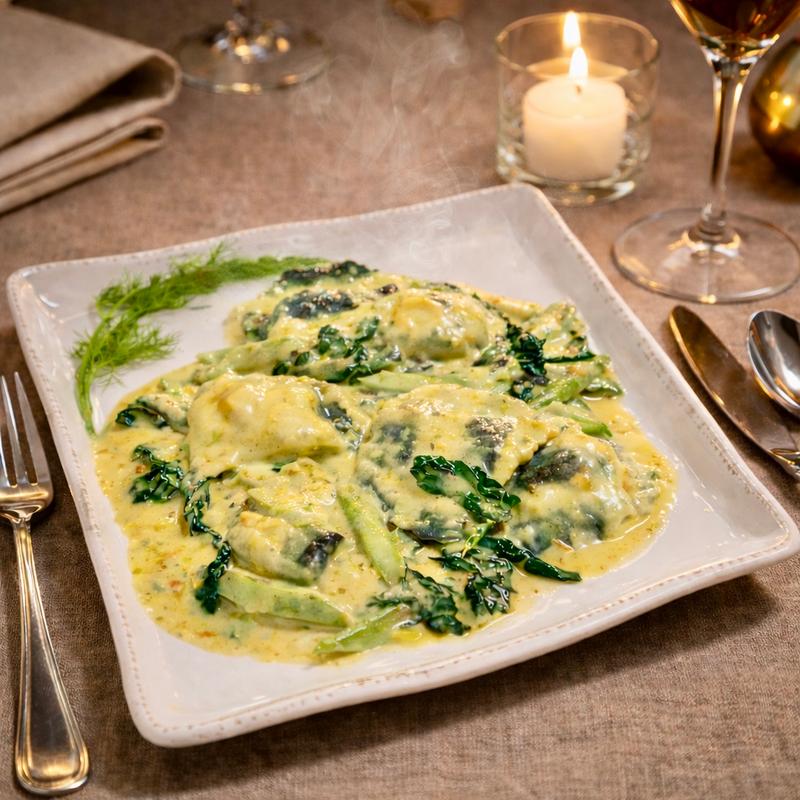 Saffron Lobster Cream Sauce, Black Italian Kale, Asparagus, Parmesan