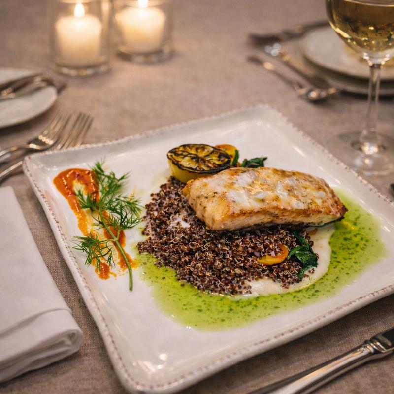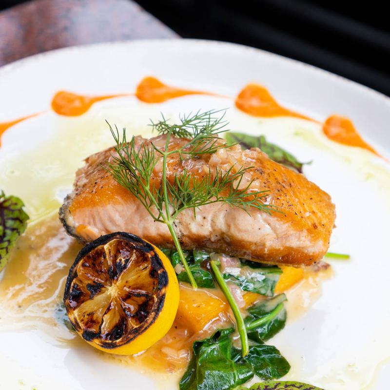 Baked Chilean Salmon, Spinach, Quinoa, Lemon Beurre Blanc, Roasted Red Bell Pepper Coulis