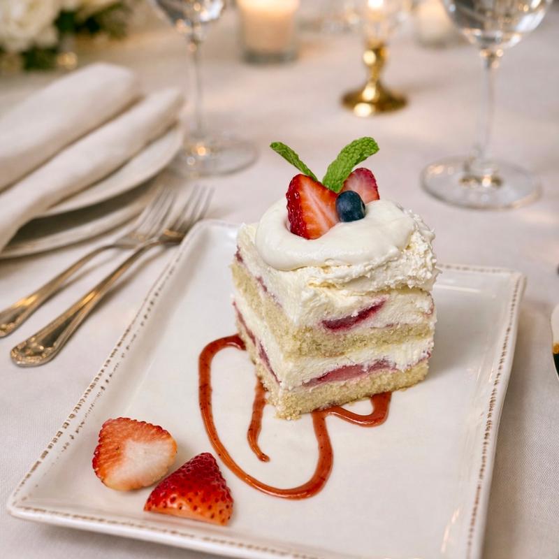 Vanilla sponge cake with mascarpone cream, white chocolate, whipped cream, and strawberry compote.